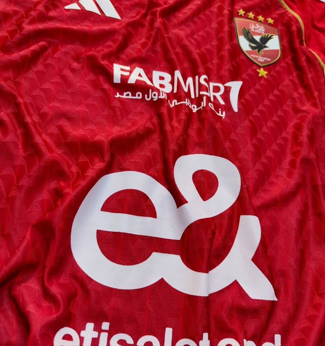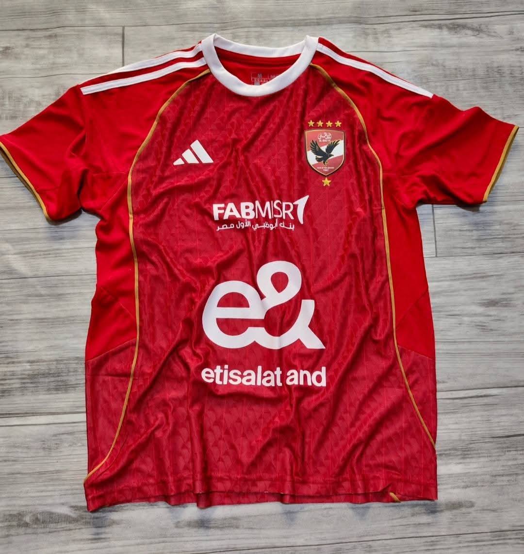 اللون والتصميم: القميص باللون الأحمر الأساسي، مع خطوط أديداس البيضاء على الكتفين والأكمام، وياقة بيضاء دائرية. كما يظهر شريط ذهبي رفيع على الأكمام وحول جوانب القميص. الشعارات والرعاة: شعار النادي الأهلي مطرز على الصدر من الجهة اليمنى. شعار أديداس (الشركة المصنعة) يقع على الصدر من الجهة اليسرى. شعارات الرعاة تتضمن "FABMISR" (بنك أبوظبي الأول مصر) و "e& etisalat.and" مطبوعة على واجهة القميص.